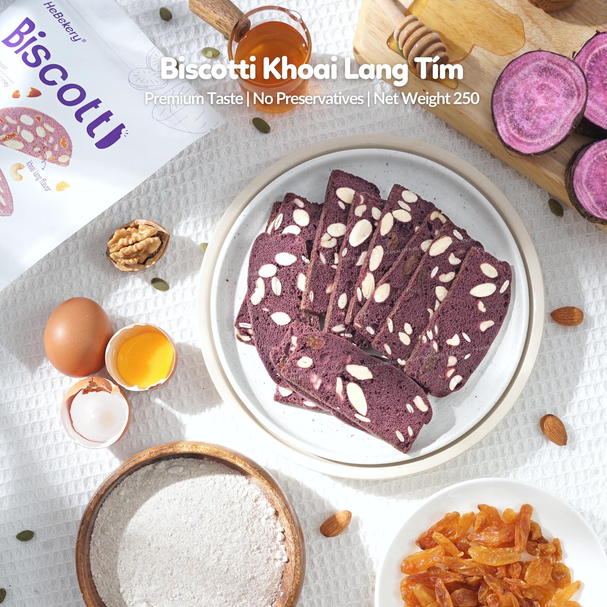 Biscotti khoai lang tím từ HeBekery được làm từ bột mì nguyên cám nhập khẩu, khoai lang nghiền tự nhiên và mật ong thiên nhiên để đảm bảo chuẩn healthy và eat clean, cùng với kỹ thuật nướng bánh handmade, tụi mình tự tin làm ra những lát bánh giòn nhất có thể.